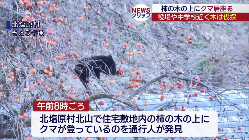 かなり大きい柿の木に50㌢程の子熊が枝先まで登り